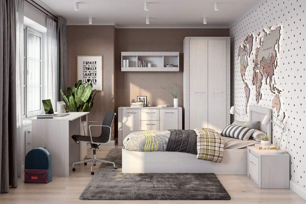В комплект входят: стол, комод 3 ящика двустворчатый,полка навесная 1200, шкаф универсальный, кровать 0,9м,тумба